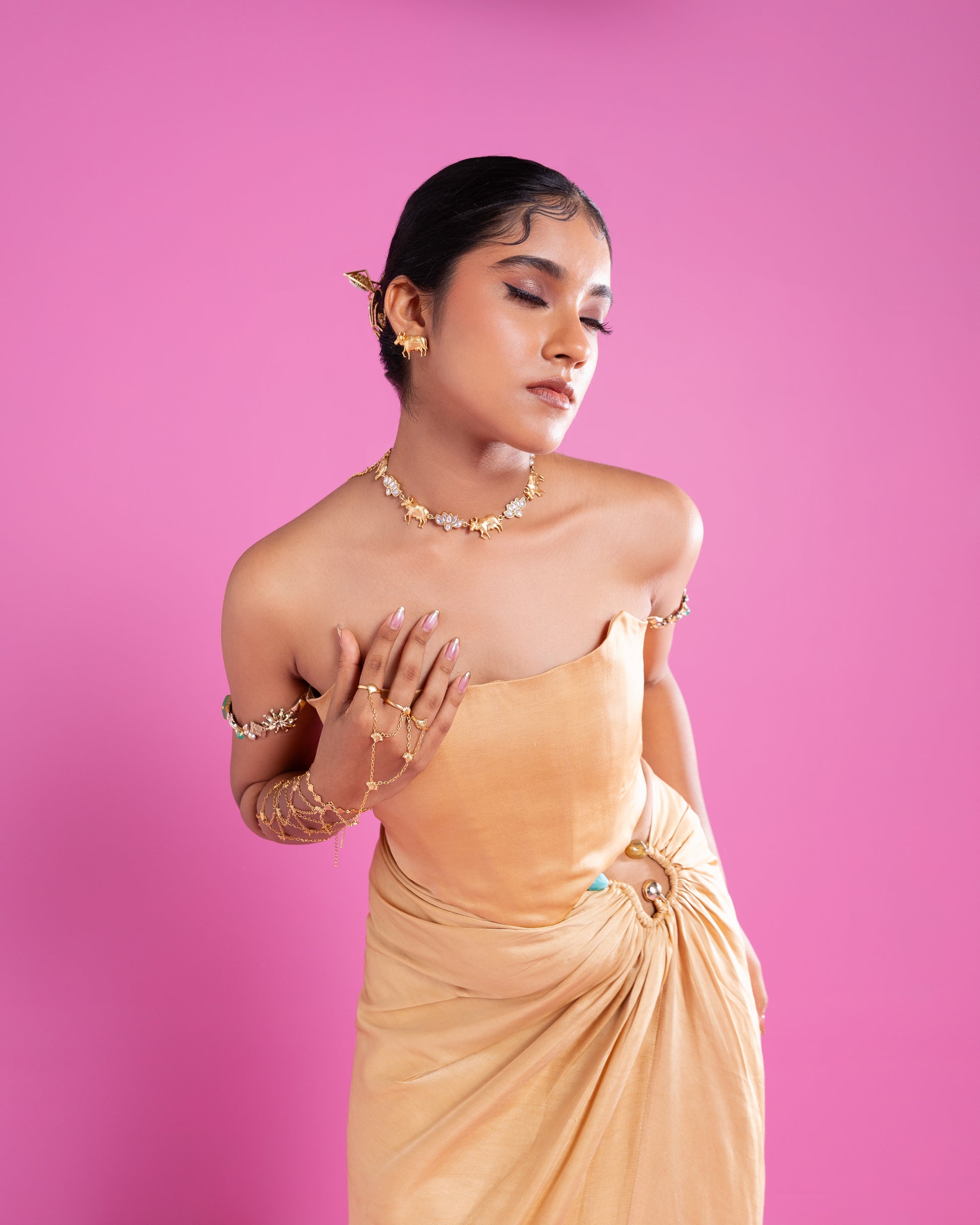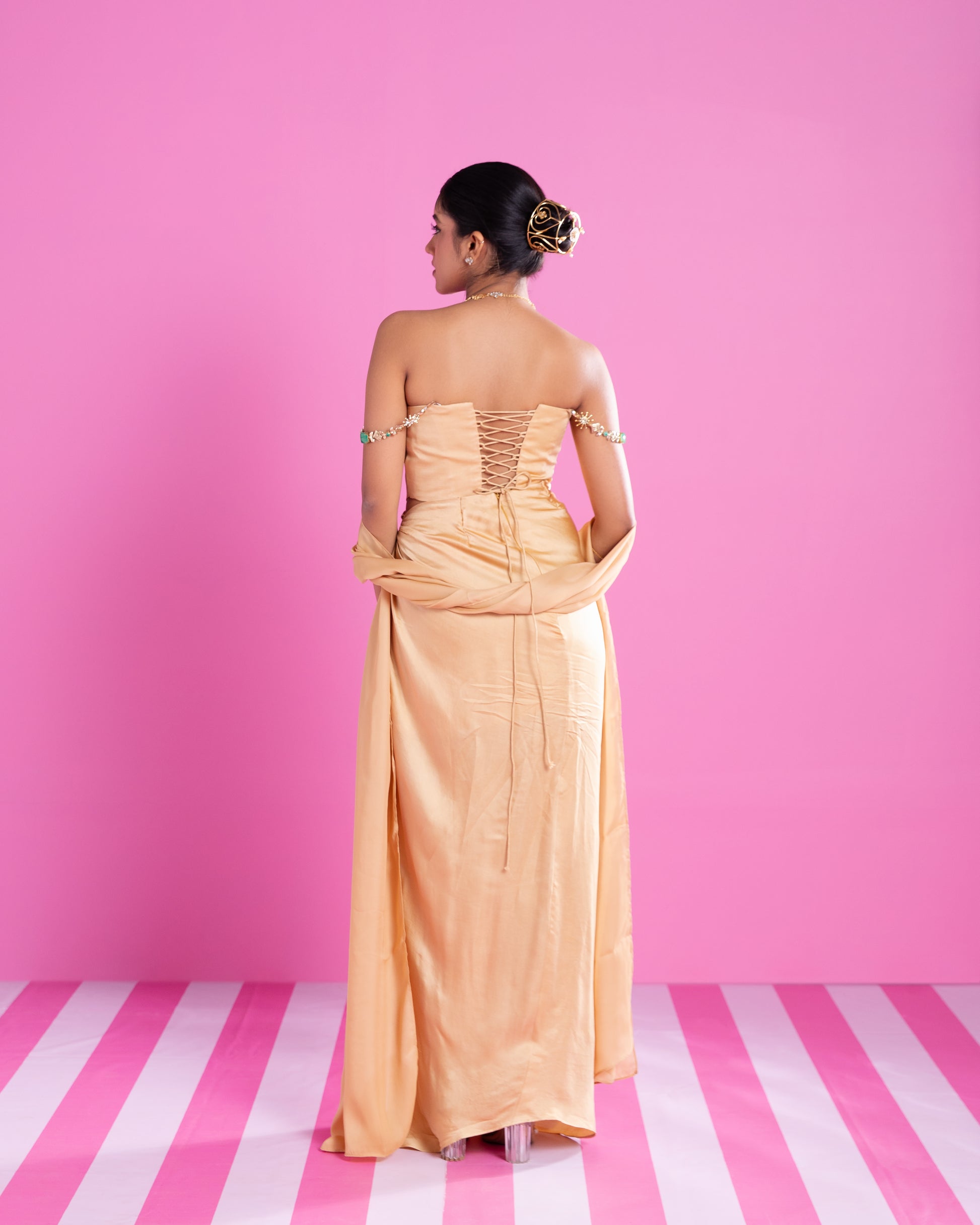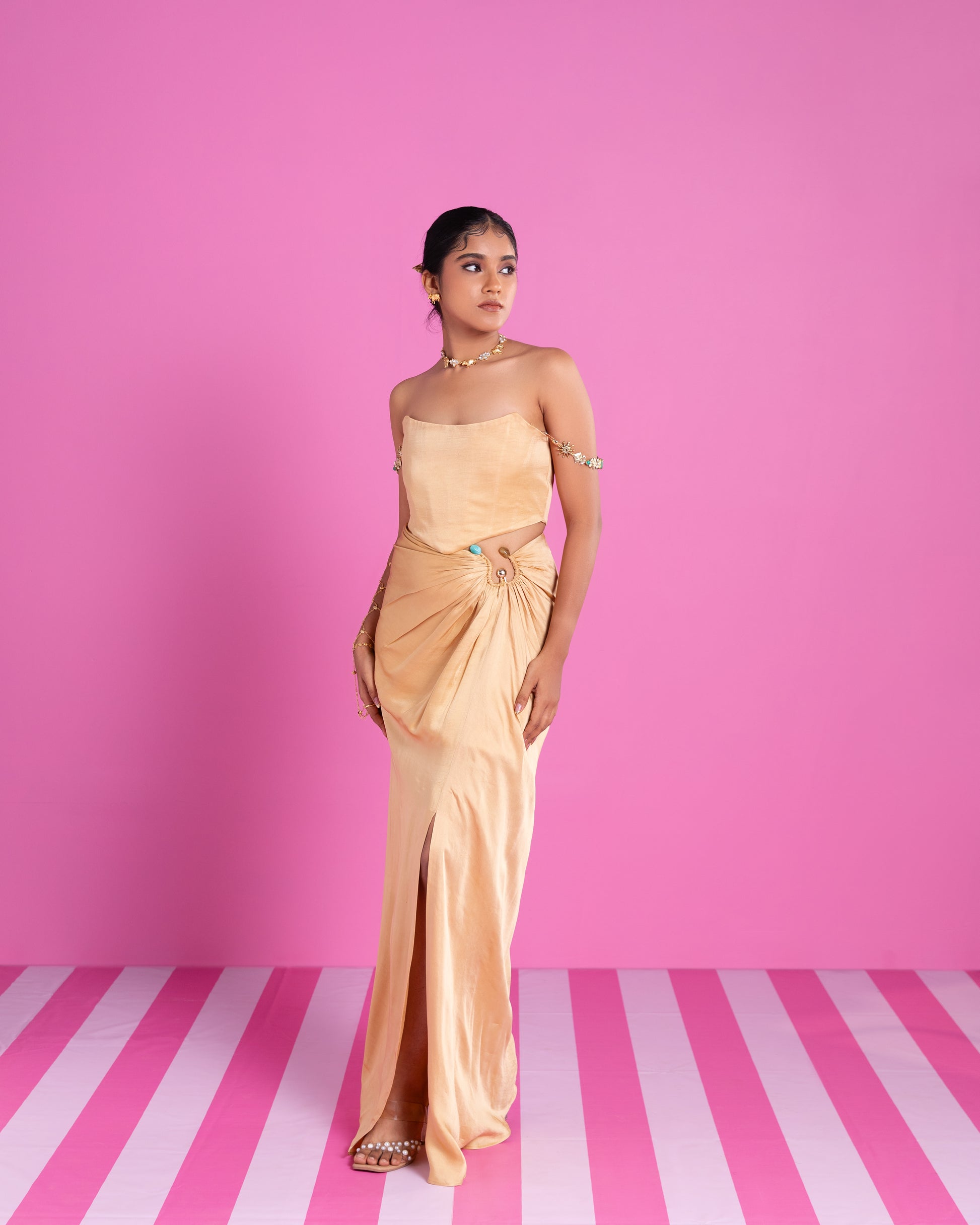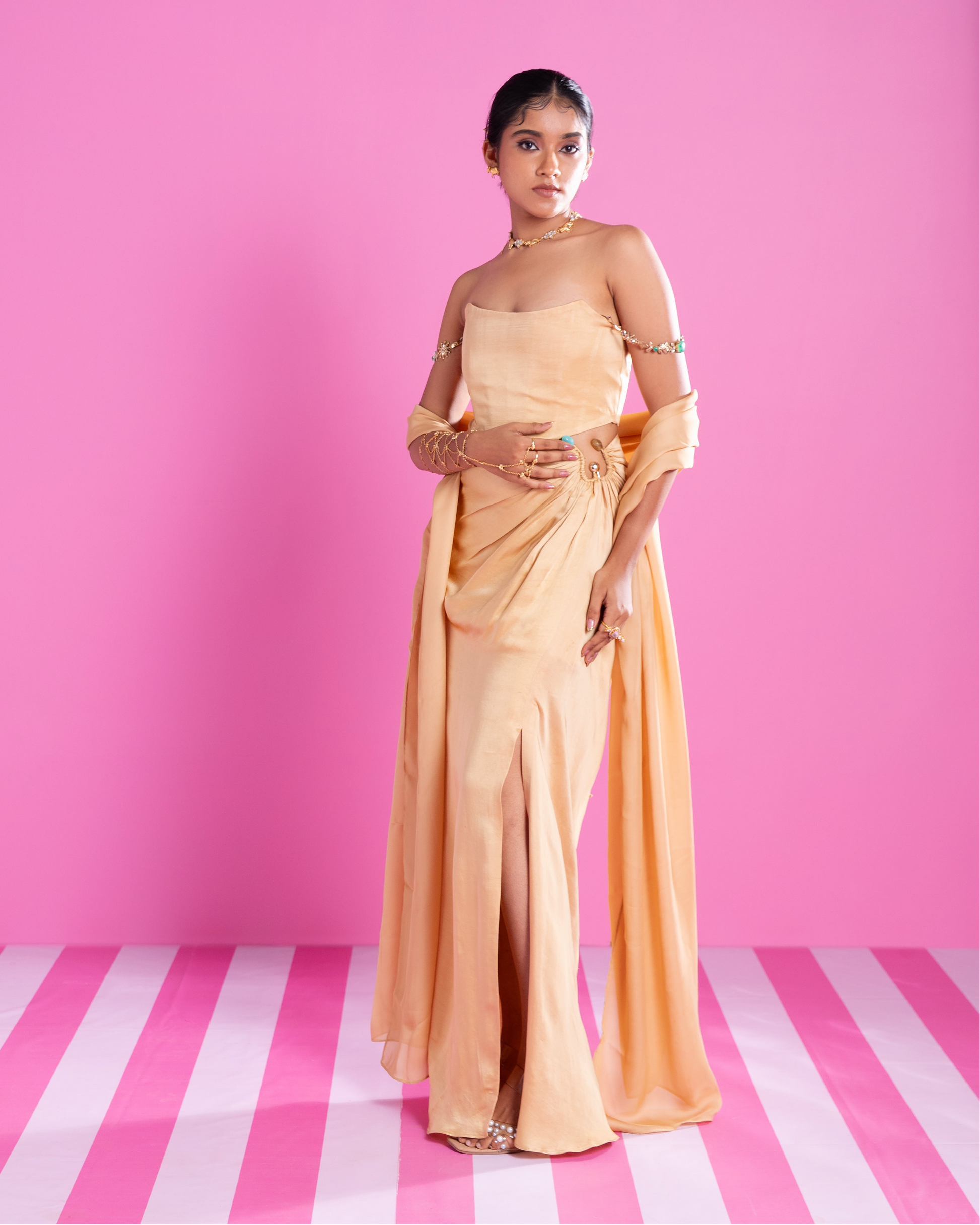 Product Description: A soft gold corset that gives a clean, structured look, paired with a draped skirt featuring a cinched waist and accented by an ornate clasp detail. Completed with a flowy dupatta that falls with grace.