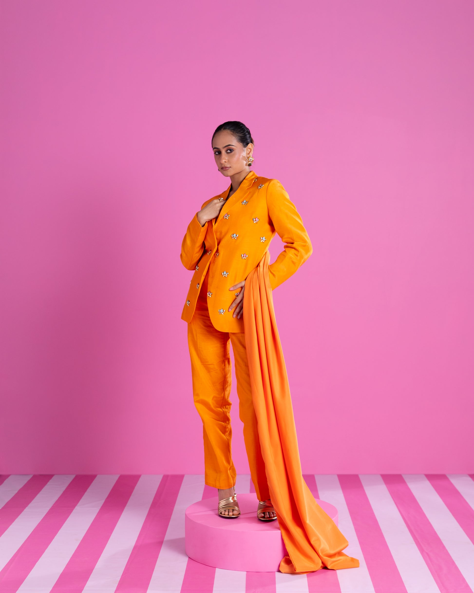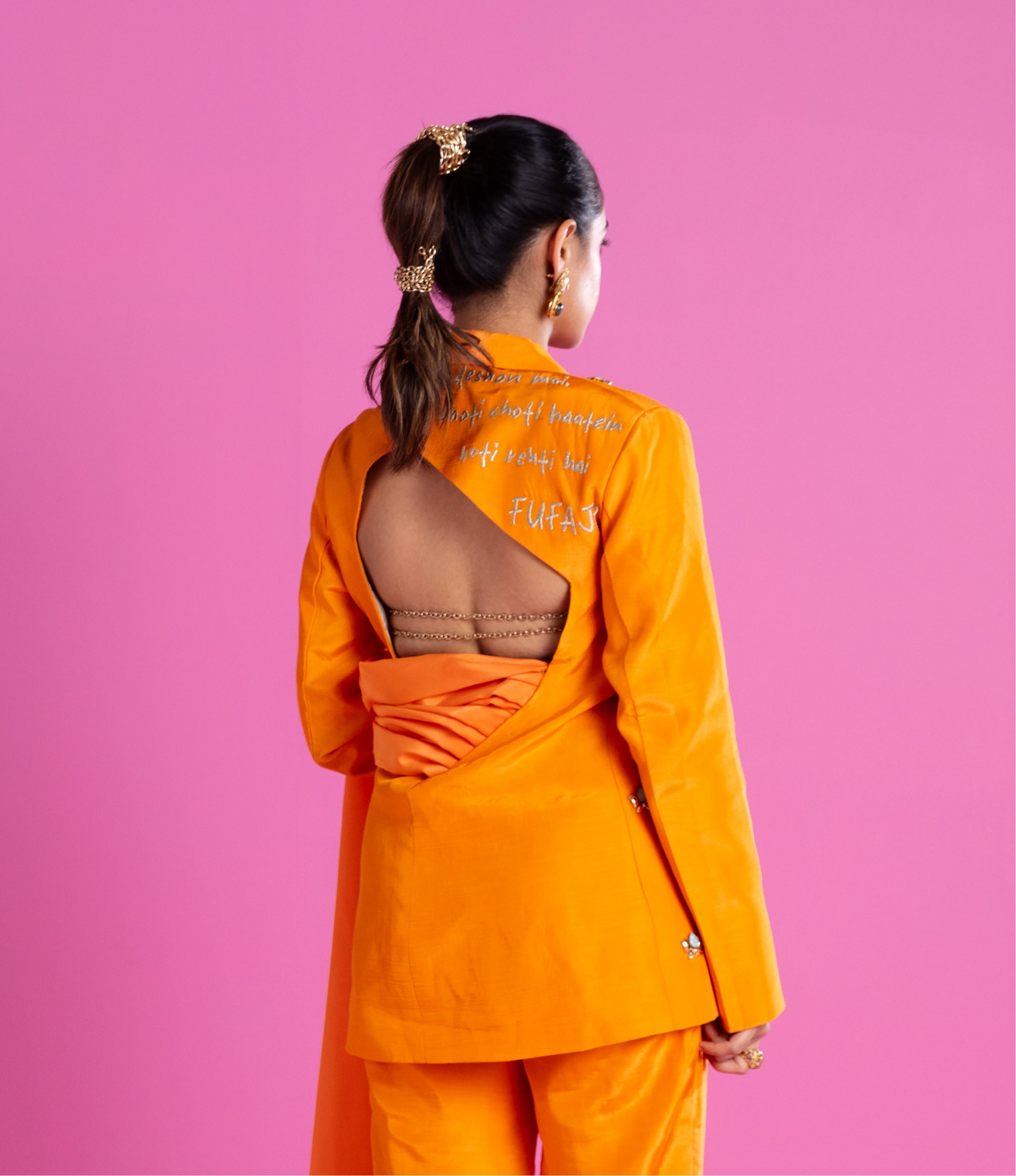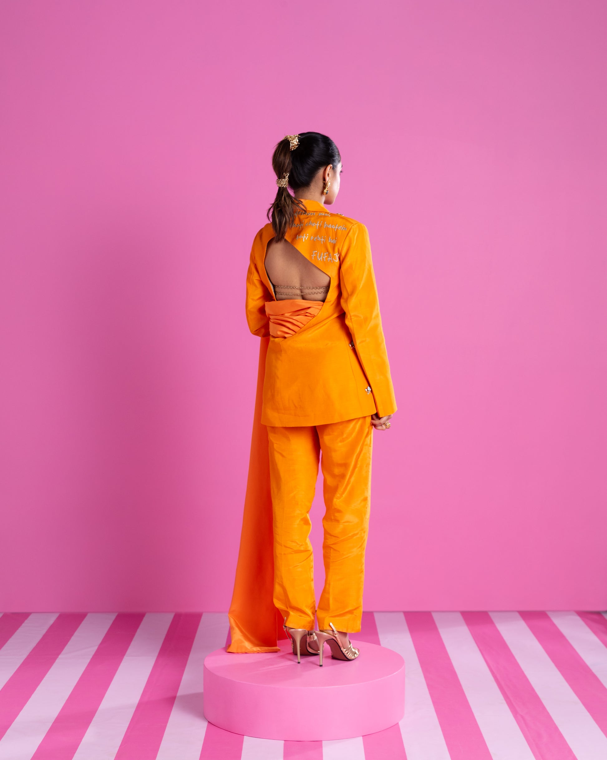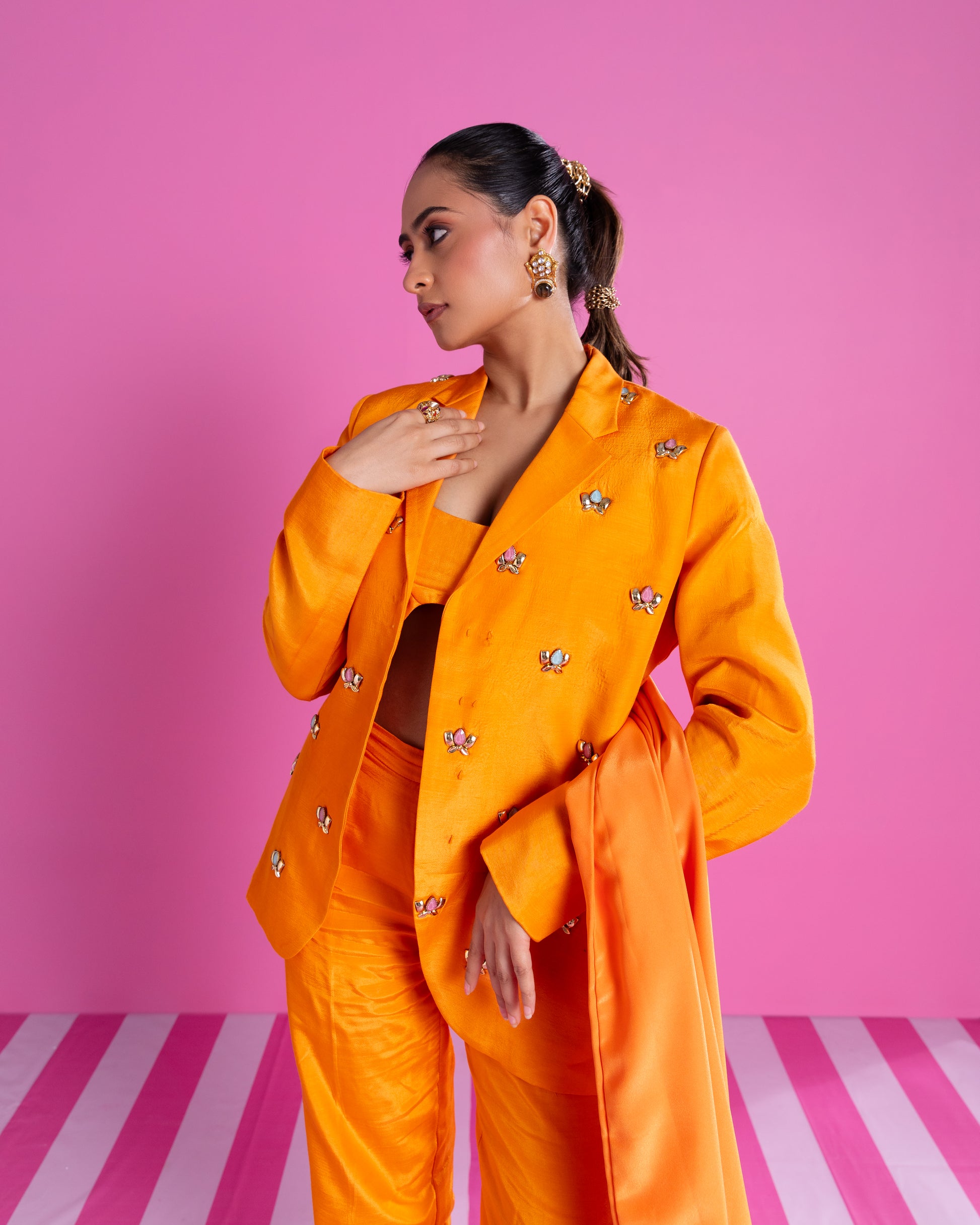Product Description: An orange blazer with hand-embroidered motifs and a bold back cutout. It’s paired with straight-fit pants and a bralette, and comes with an attached trail that grabs attention with every step.