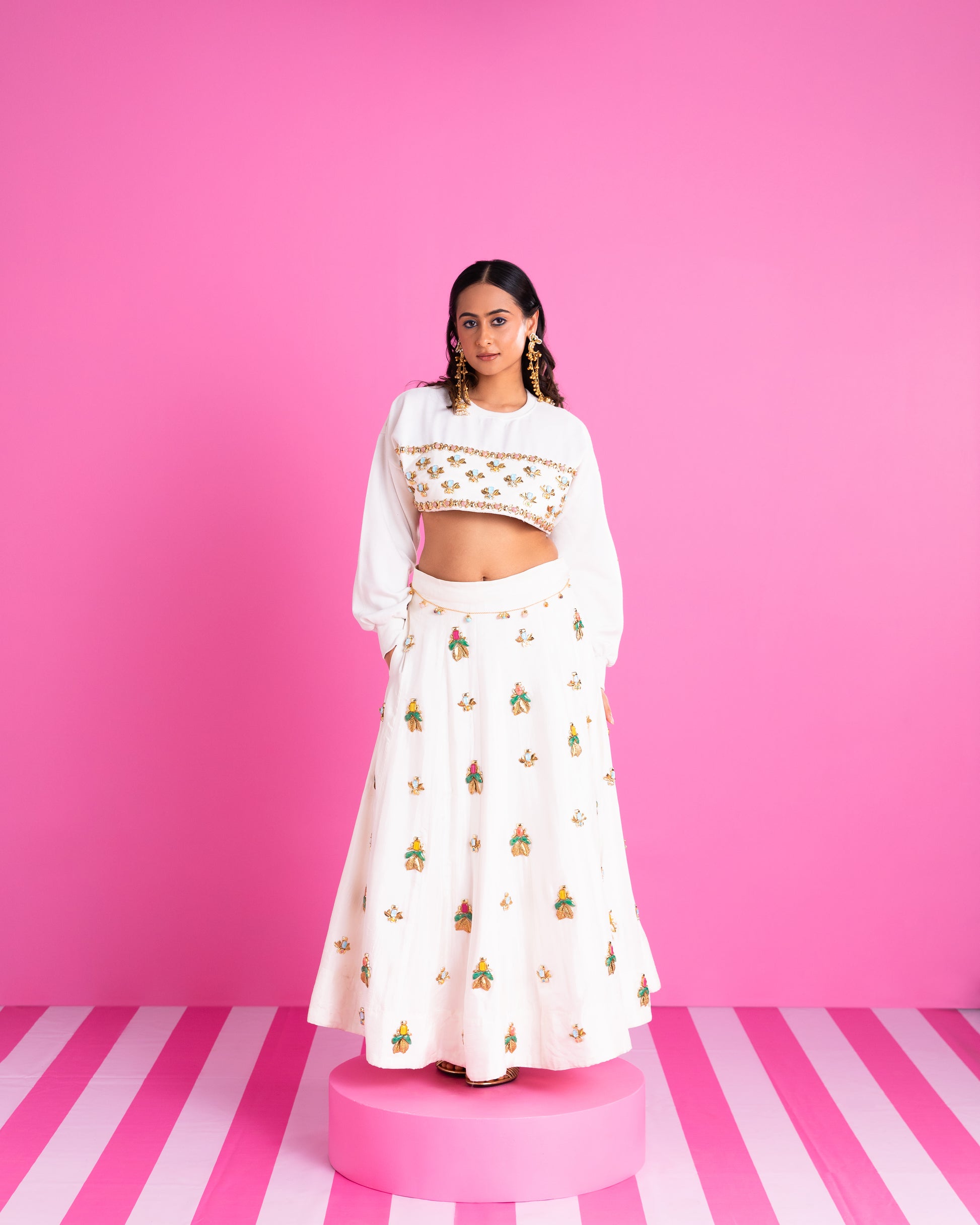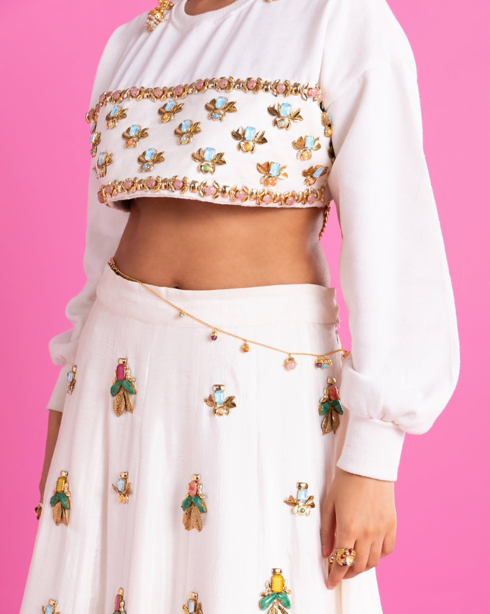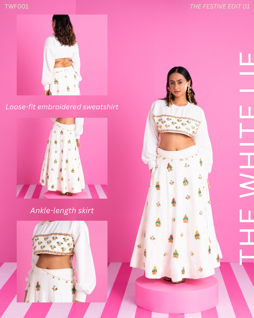 Product Description: An off-white cropped sweatshirt, designed with intricate hand-embroidery and finished with a sleek back-chain detail, redefines relaxed luxury. Paired effortlessly with an ankle-length lehenga, hand-embellished with playful, meticulously crafted motifs and designed with pockets. A prefect blend of. comfort and drama.