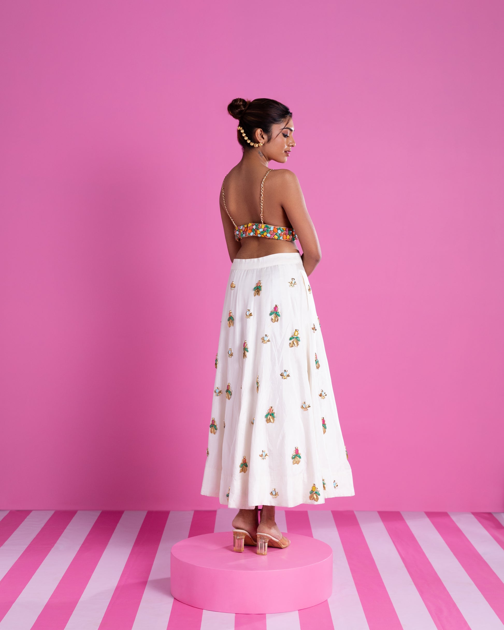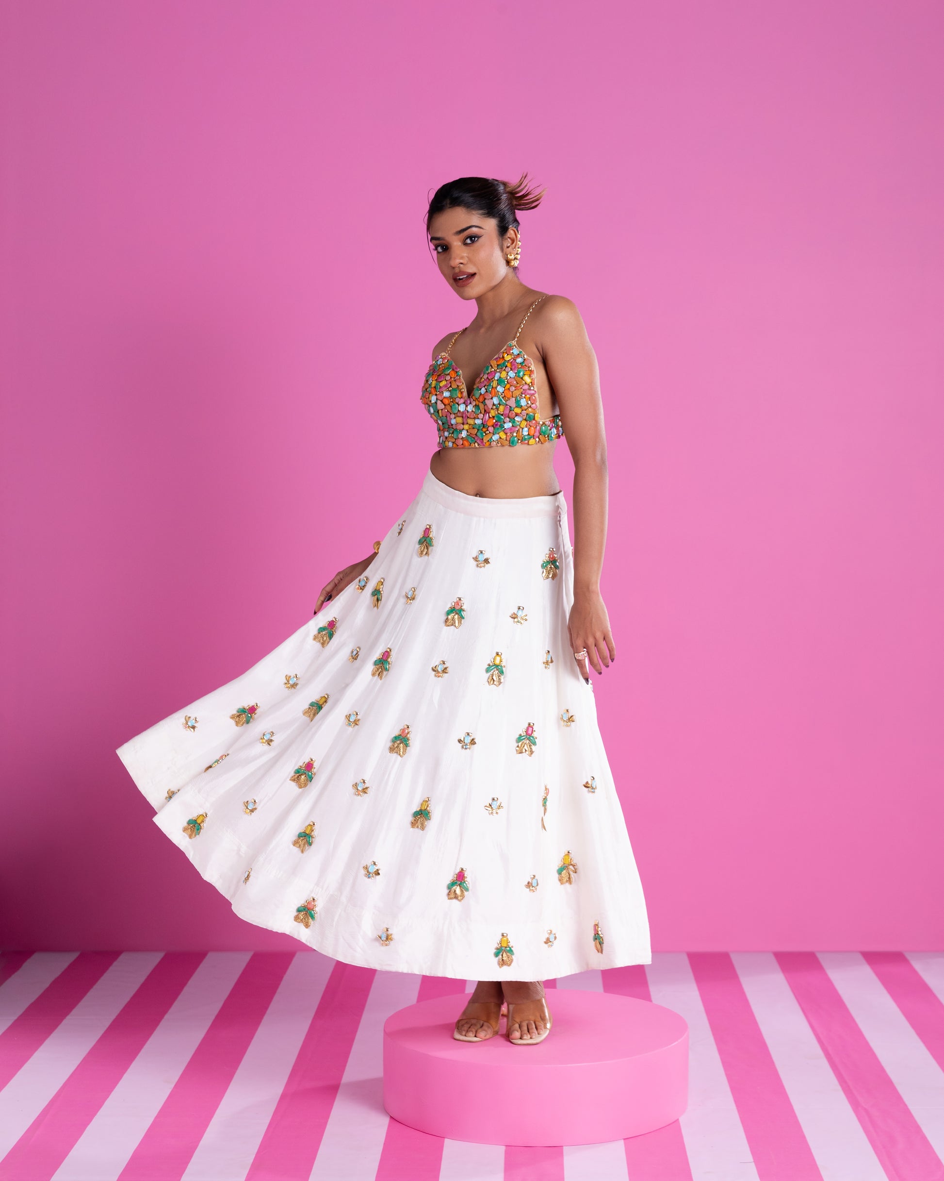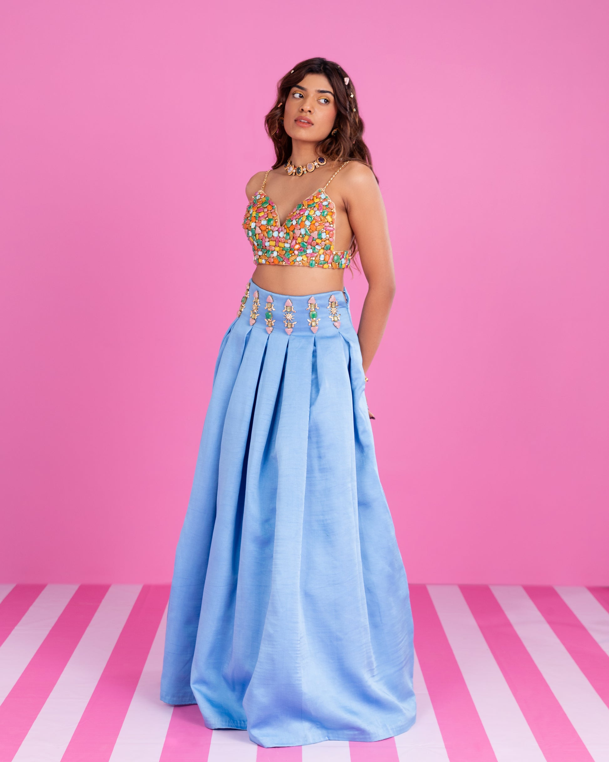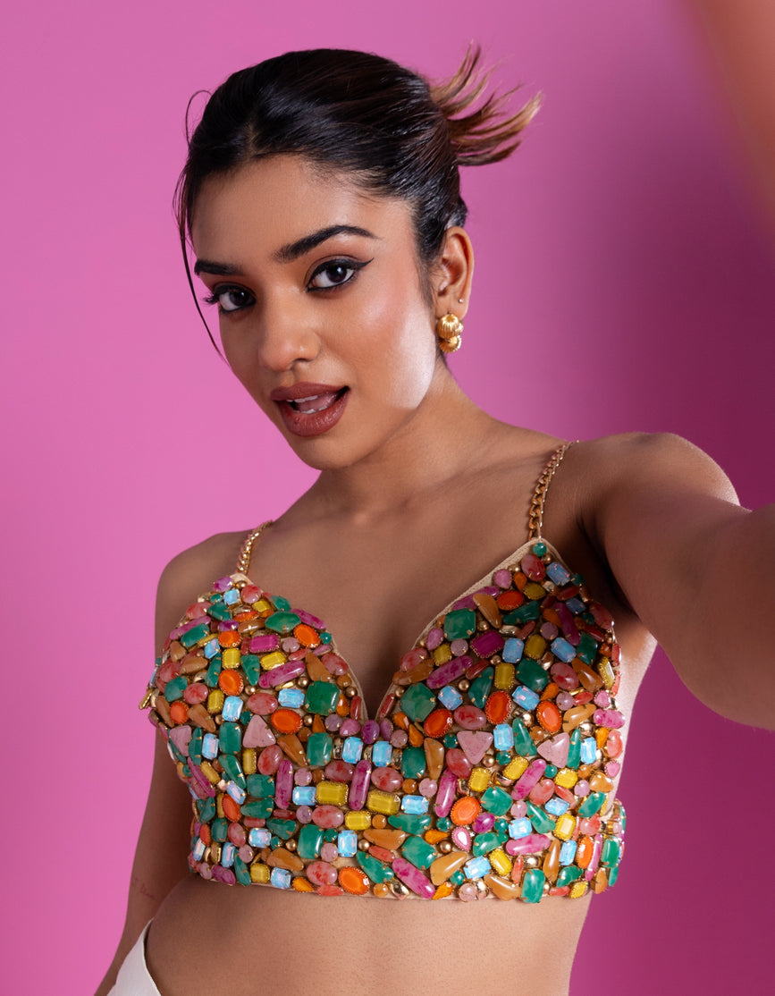 Product Description: The vibrant, heavy hand-embellished bustier, studded with multicoloured stones, is made to steal the spotlight. Every glint catches the light, every detail demands attention — the kind of piece you don’t just wear, you arrive in.